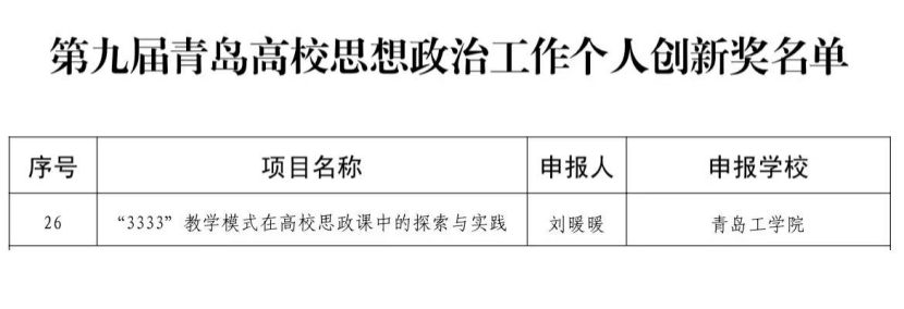 刘暖暖老师主持的《“3333”教学模式在高校思政课中的探索与实践》项目,荣获第九届青岛高校思想政治工作个人创新奖。该项目围绕思政课教学改革,系统构建了“三阶递进、三维融合、三环联动、三力提升”的教学新模式,有效增强了思政课的思想性、理论性和亲和力,为推动高校思政课高质量发展提供了有益探索。