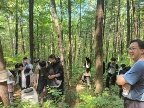 7月1日下午,张红光老师带领学生深入老山,探访了天然水曲柳生态系统定位观测站,这里是一处珍贵的自然宝库,学生们在这里了解到了生态系统定位观测的重要性和作用。在林业有害生物防治“网格化”监测体系检测固定样地,张老师生动讲解了如何利用现代科技手段进行精准监测与防治,让学生们见识到了科技与生态相结合的智慧。在樟子松人工生态系统定位观测站和红松人工生态系统定位观测站,学生们目睹了人工林的壮丽景象,学习了落、红、樟多层次群落结构实验林标准地的管理技巧,了解到了水曲柳,黄菠萝,胡桃楸等东北特有的植物习性。张老师的专业指导让学生们对各种植物的特点及区分方法有了深入理解,也激发了他们对生态学的兴趣,让学生们对各种植物的特征、生长习性以及如何区分不同种类的树木有了深入的理解,见识了前沿的种植技术和生态防护措施。