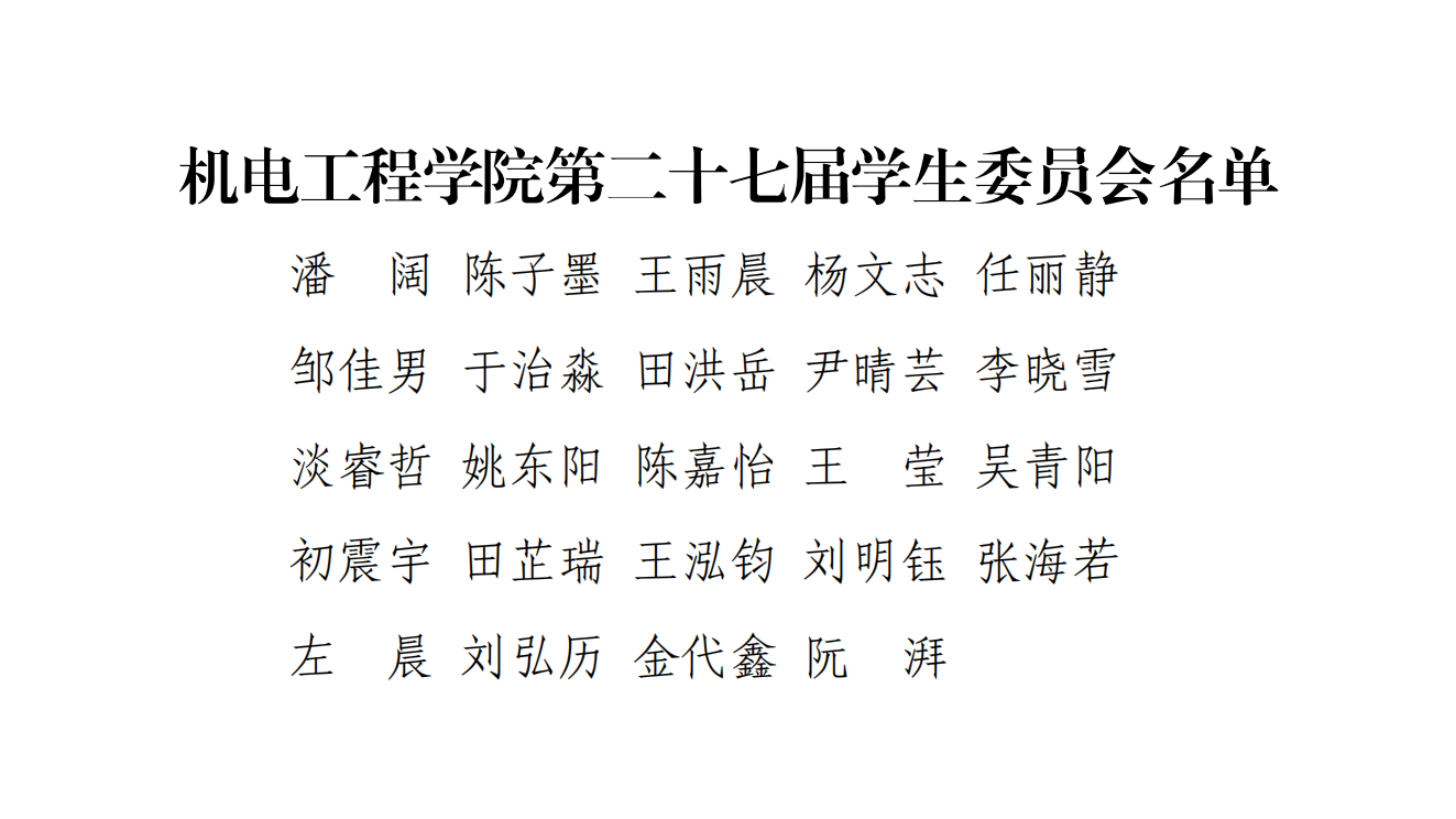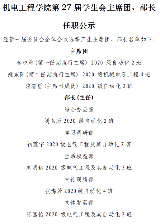 经投票,李晓雪、淡睿哲、姚东阳3名同学当选为新一届学生会主席团成员;潘阔、王雨晨、李晓雪等24名同学当选新葡的京集团35222vip第二十七届学生委员会委员。