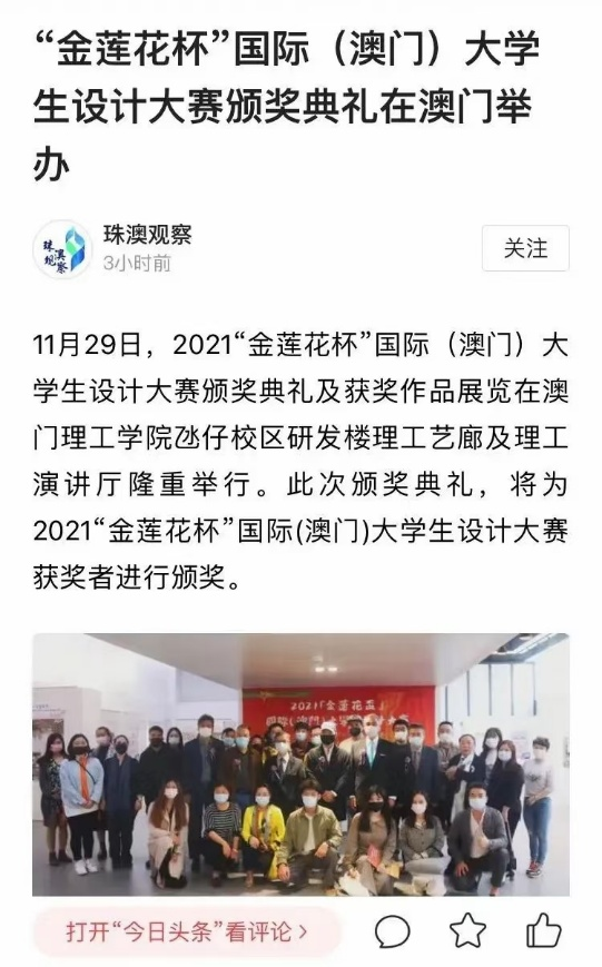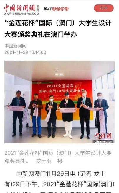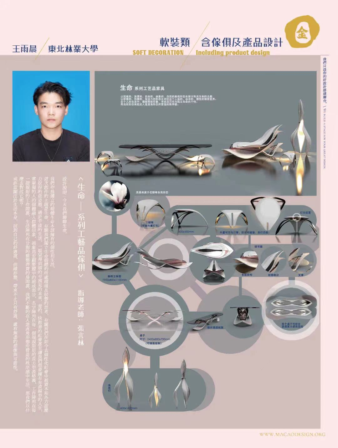 11月29日,由澳门国际设计联合会(Union for International Design of Macao)举办的2021“金莲花杯”国际(澳门)大学生设计大赛颁奖典礼及获奖作品展开幕式在澳门理工学院氹仔校区理工演讲厅及理工艺廊举行。由新葡的京官网工业设计专业张言林教师指导,2019级工业设计专业王雨晨同学设计的作品《生命系列工艺品家具》,经过大赛评委层层筛选,最终拔得头筹,获得2021「金莲花杯」国际(澳门)大学生设计大赛软装类金奖,清华大学获得建筑类金奖,广州华商学院获得室内空间类金奖。