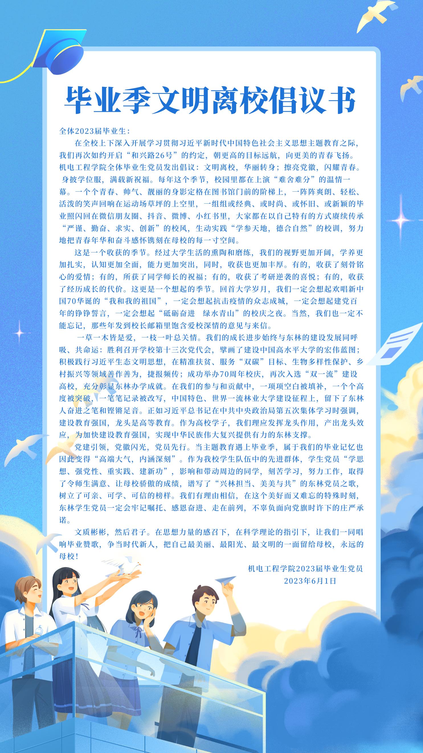 在全校上下深入开展学习贯彻习近平新时代中国特色社会主义思想主题教育之际,我们再次如约开启“和兴路26号”的约定,朝更高的目标远航,向更美的青春飞扬。新葡的京集团35222vip全体毕业生党员发出倡议:文明离校,华丽转身;擦亮党徽,闪耀青春。