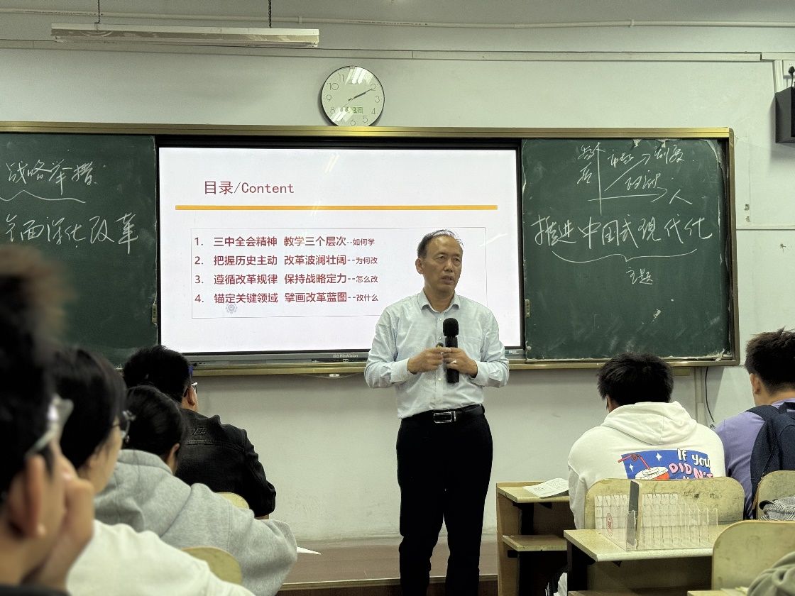 党的二十届三中全会,是在以中国式现代化全面推进强国建设、民族复兴历史伟业的关键时刻召开的重要会议。为深入学习宣传贯彻党的二十届三中全会精神,推动学院师生深刻认识进一步全面深化改革、推进中国式现代化的重要意义,10月16日下午,Beat365官方网站毛泽东思想和中国特色社会主义理论体系概论教研室、习近平新时代中国特色社会主义思想概论教研室、形势与政策教研室全体教师共同学习二十届三中全会精神专题课。郝明杨教授以“改革的实践续篇 现代化的时代新篇”为主题对党的二十届三中全会精神进行解读。