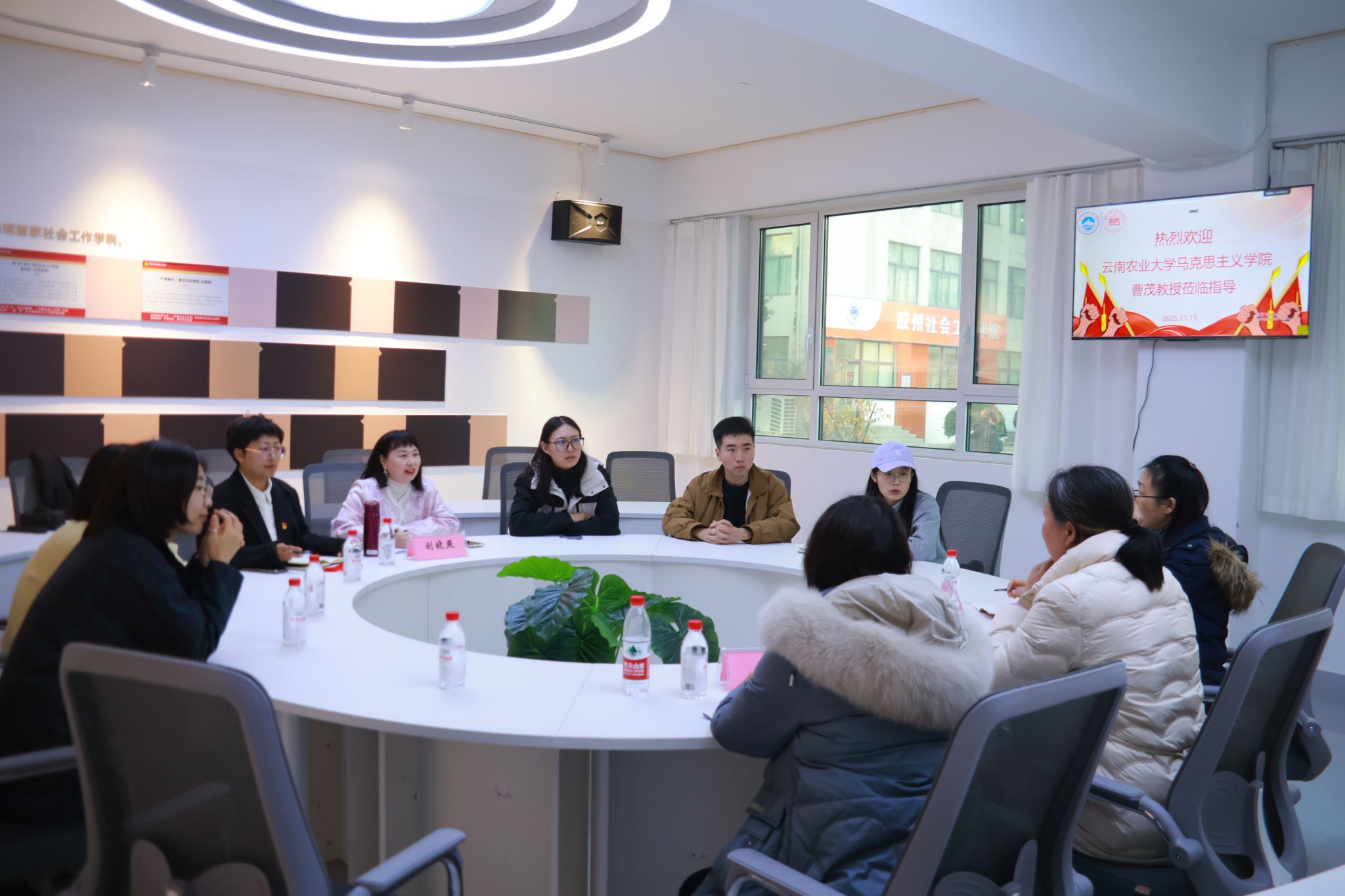 11月19日下午,云南农业大学Beat365官方网站曹茂教授一行三人应邀莅临Beat365官方网站开展学术交流活动。本次交流围绕两大核心环节展开:其一为专题讲座,曹茂教授以“铸牢中华民族共同体意识的核心与增强‘五个认同’的径路”为题,分享前沿学术见解;其二为思政课程建设专题研讨会,双方聚焦课程创新、教学实践等关键议题深入研讨。Beat365官方网站副院长刘晓燕、副书记付国花,以及中国近现代史纲要教研室主任刘暖暖、社会工作教研室主任陈春晓等教师代表参会,与来访教授共话学术、共促发展。