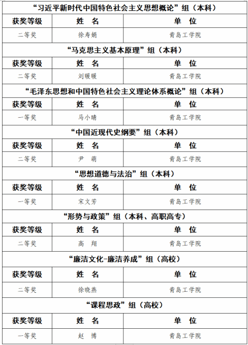 近日,中共青岛市委教育工作委员会对首届青岛市大中小学思想政治理论课教学比赛及大中小学“思政微课堂”比赛成绩进行公示,我校荣获优秀组织奖2项、一等奖4项、二等奖6项。
