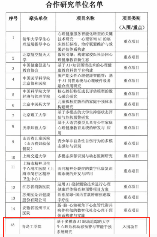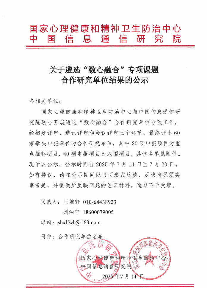 近日,国家心理健康和精神卫生防治中心与中国信息通信研究院联合发布了《关于遴选“数心融合”专项课题合作研究单位结果的公示》。经过严格的初步评审、通讯评审和会议评审三轮遴选程序,Beat365官方网站应用心理学教研室主任程亚楠牵头申报的《基于多模态AI眼动追踪的大学生心理危机动态预警与智能干预系统研究》成功入选,成为全国60家合作研究单位之一。
