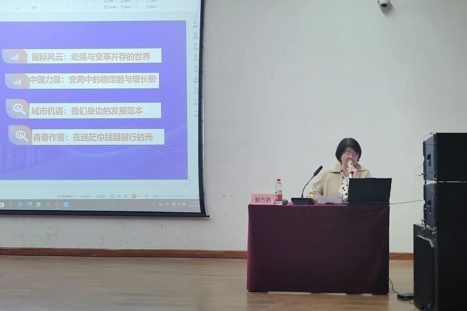 随后,郑方娇老师以《悉达多》这本书为切入点,并结合全球经济格局和中国力量,与同学们展开深入交流,分析了大学生常见的迷茫类型,如专业方向模糊、未来职业选择焦虑、自我价值感缺失等,并指出:“青春或许会迷茫,但时代从不辜负奔跑的人。愿你以今日之所学,铸明日之底气,在时代的坐标系中,找到属于自己的坐标点。”